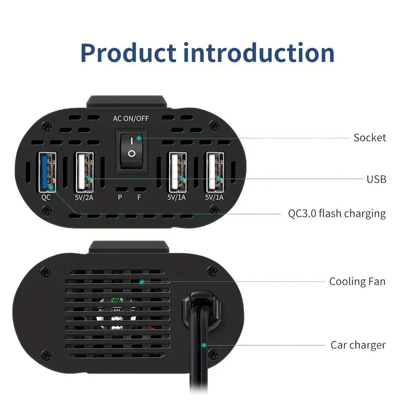 Inversor de Energía para Coche - 500W Pico, DC 12V a AC 110V, Pantalla LCD, Salidas AC Dobles, 4 Cargadores USB para Coche, Adecuado para Coches, Hogares, Portátiles, Camiones, Enchufe Estadounidense
